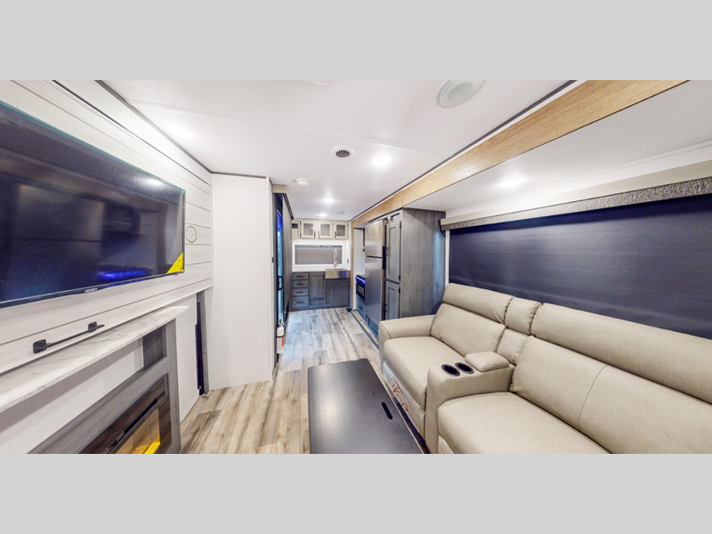 Each model is built with a heated and enclosed underbelly and smooth front metal for added protection against the elements. There is also a 100-watt solar panel outside, along with a power awning with LED lights and fender skirts. You'll love the 6' 10" height inside, along with pleated night shades and seamless thermofoil countertops in the kitchen.