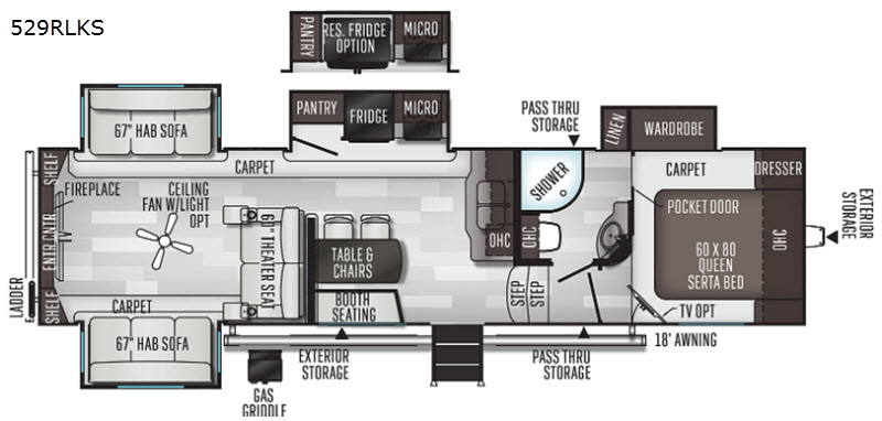Looking for a separate dining and kitchen area from the living quarters? This unit will have you dreaming of all the places you can travel and stay at in this fifth wheel. The living area includes a rear wall entertainment center with a TV, a fireplace, and shelving. Everyone can sit on the dual opposing hide-a-bed sofa slide outs, or theater seats to watch a movie or the big game. The chef can make meals in the separate kitchen and dining area with all the appliances and counter space available. The unique table and chairs plus booth seating is a bonus feature you are sure to love. You might like to add a few options such as a residential refrigerator, a ceiling fan, and/or a TV in the bedroom. Take a look!