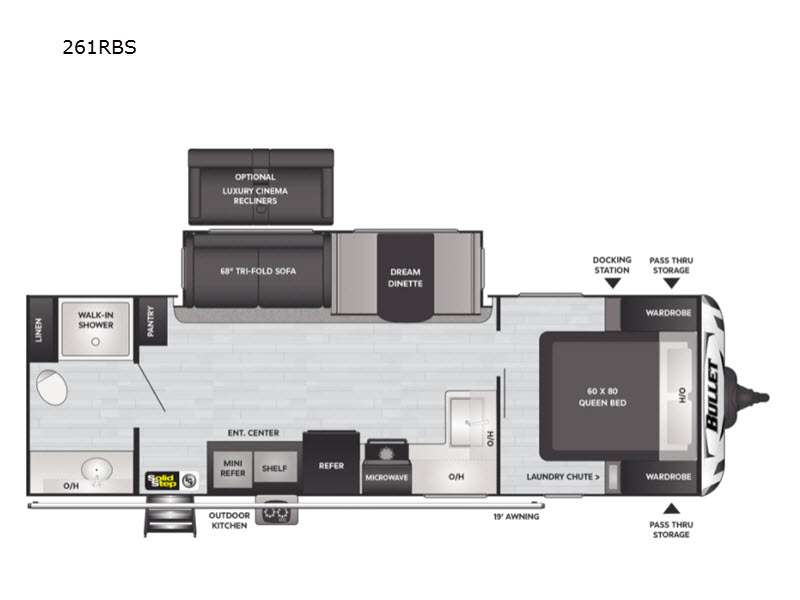 Load up your family or friends and head out to a quiet retreat at your favorite campground with this Bullet travel trailer by Keystone. Before you head inside, check out the outdoor kitchen which features a two-burner range top and mini refrigerator that will keep your drinks or snacks cool. In the evening, you can sit underneath the 19' electric awning with LED light strip and enjoy the scenic sunset. Inside this trailer you will love how open and spacious the kitchen and living area feel with the single slide that includes the Dream dinette and theater seats. The large bathroom is in the rear of this trailer and includes linen storage, and the private bedroom is in the front and includes a space saving sliding door and plenty of storage.